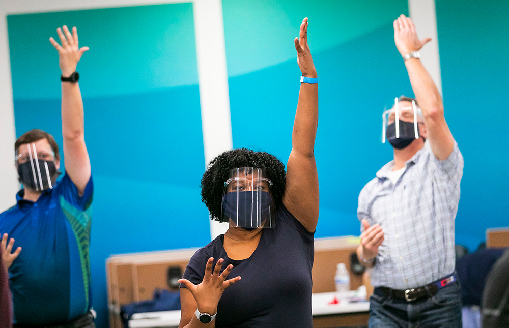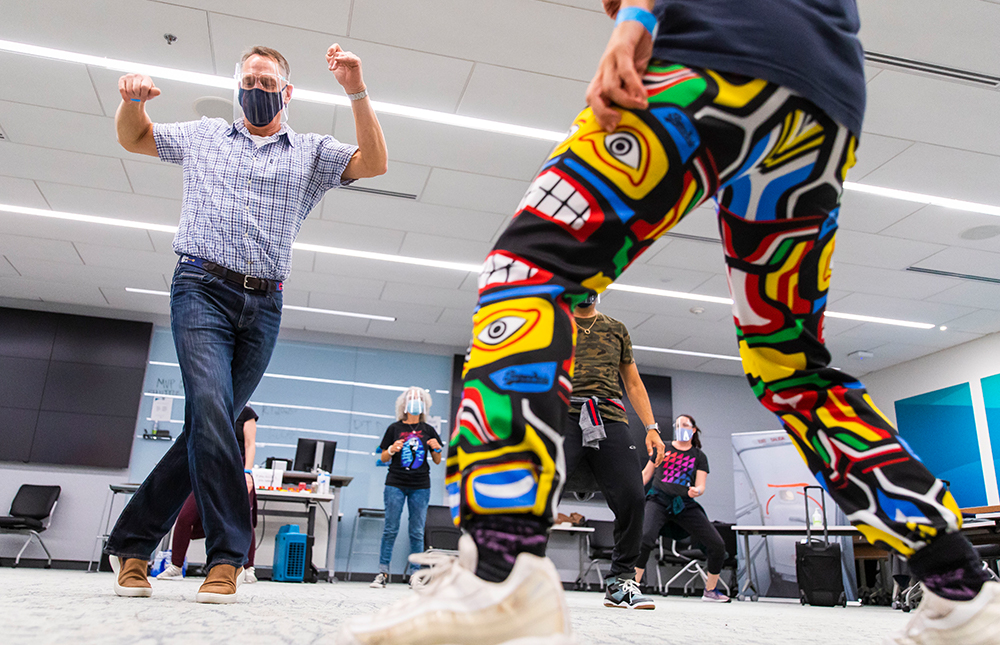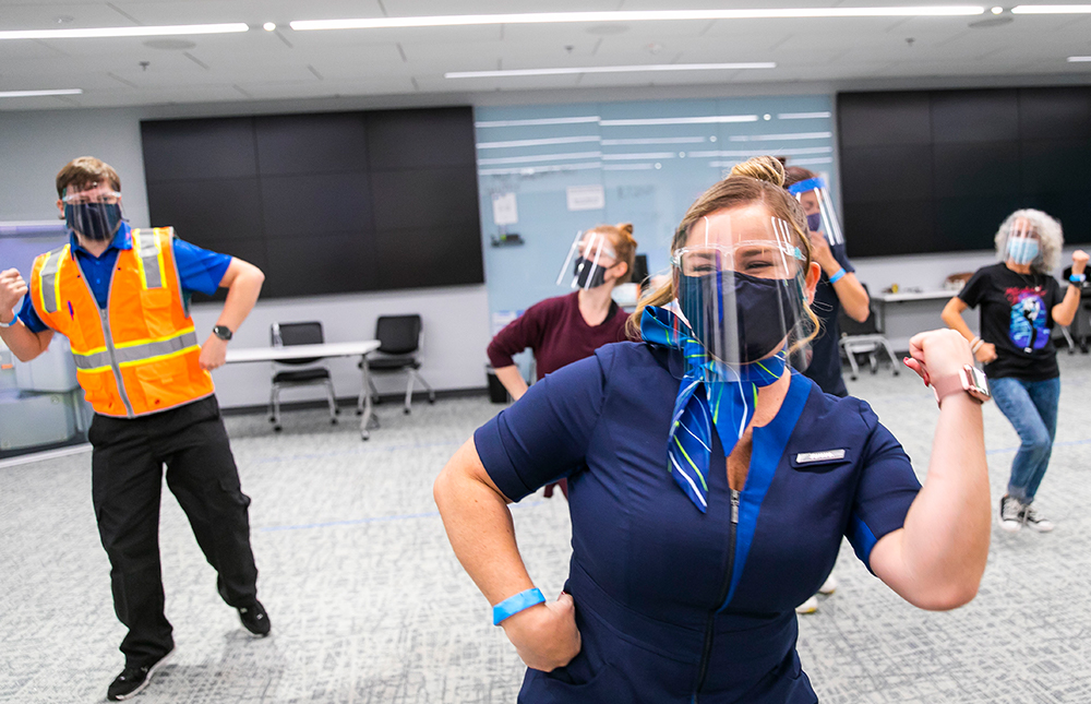 The faces behind the masks are our very own employees! Employees were chosen for the video in a variety of ways including a few from our Alaska Flight Attendant Drill Team—who dance through the streets of Seattle for the Torchlight Parade and other events around the country to represent the company. Others were chosen based on workgroups, ability and willingness to dance, and leader nominations.