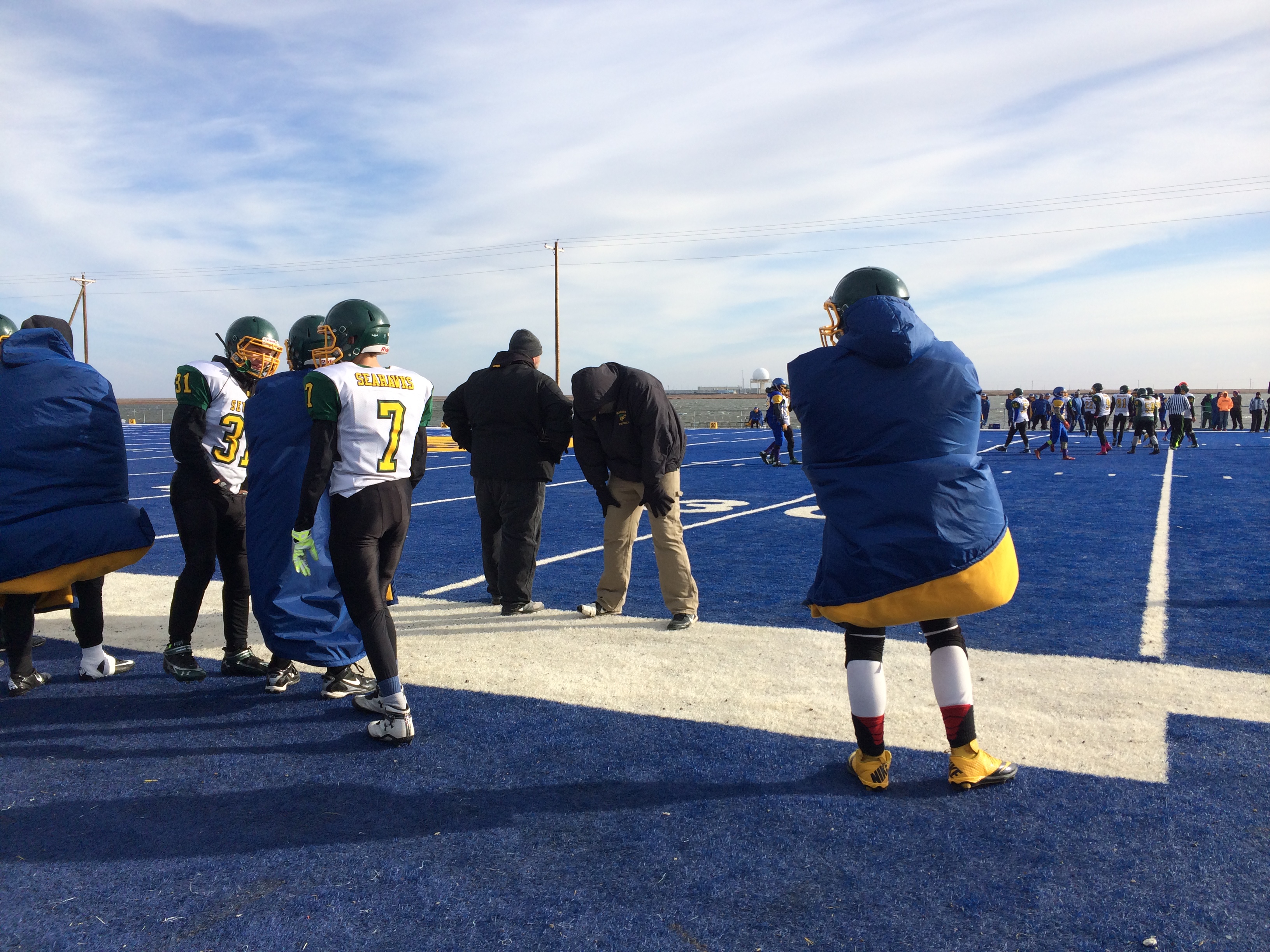 And the community has embraced it. The booster club serves homemade hot meals from the concessions stand, while bundled-up spectators – with and without children of their own – watch from the stands, their cars or the warming buses – two school buses kept running throughout the games so chilly football fans have a place to warm up.