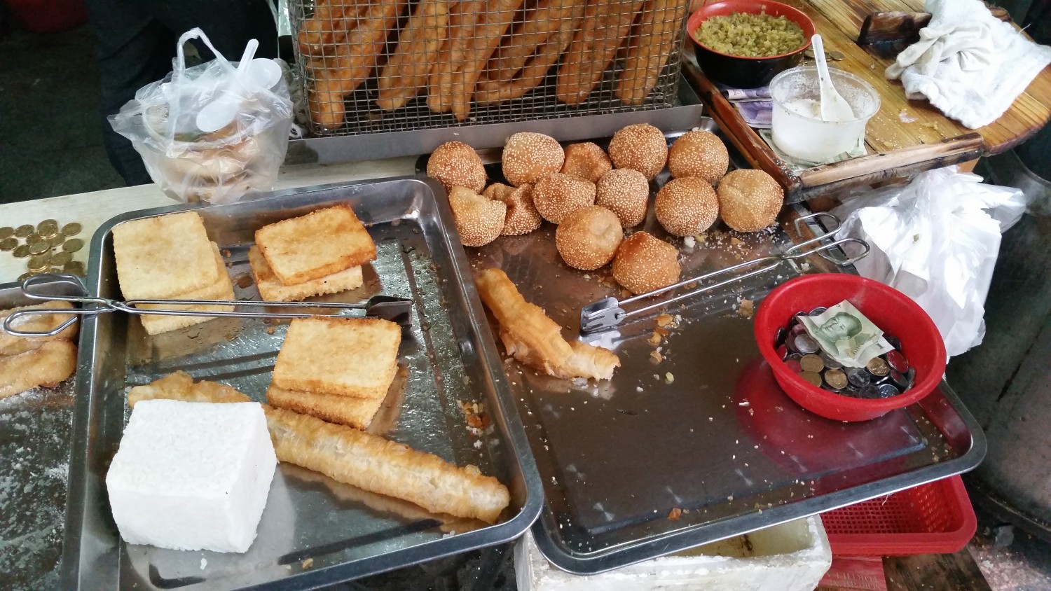 I go for a pork steamed bun from an open-front stand, some longan fruit from a curb vendor, and a baseball-sized rice ball filled with egg and bean paste from a food truck. Each “course” costs less than 50 cents. Fun.