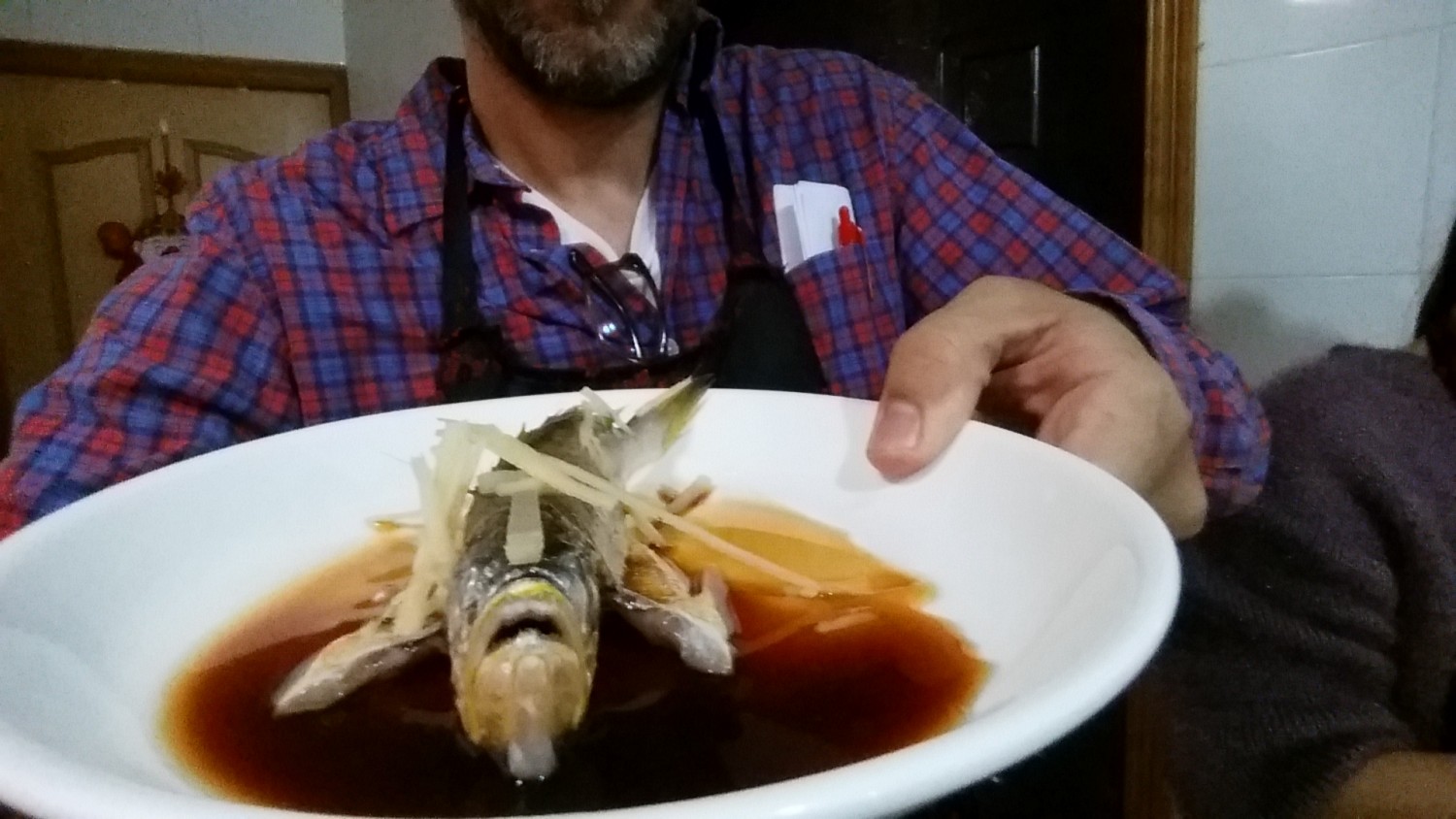 Our cooking assistant Zhang Feng meets the five students (me, a visiting German couple and local expat friends from Spain and Italy) on a busy boulevard not far from the French Concession. Zhang moved to Shanghai four months ago for “opportunity.” She hands us umbrellas for the mid-day drizzle and leads us to a nearby back street and a “wet market” with two floors of meats and local produce. She appoints us with the tasks for the day’s ingredients, which include lotus, tomato, whole yellow croaker fish, chicken filets. I’m responsible for qie zi, or eggplant. A woman sells me more than I need, then jokingly tries to push some mushrooms.