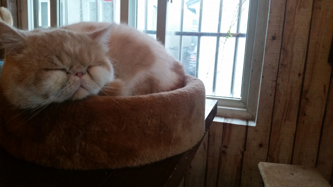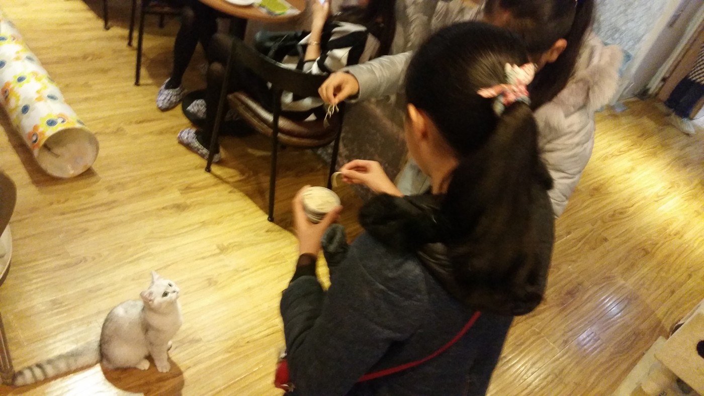 Afterwards, I walk on in the crowd – occasionally a motor scooter beeps its passing – when a sign in English catches my eye: “CAT CAFÉ! Cute cats will welcome you with coffee and music!” Taught never to say “no” to cats, I head down the alley lined with color photos of cats. Inside, staff members offer covers for my wet shoes. “We have 30 cats,” one woman says. “You will enjoy.”