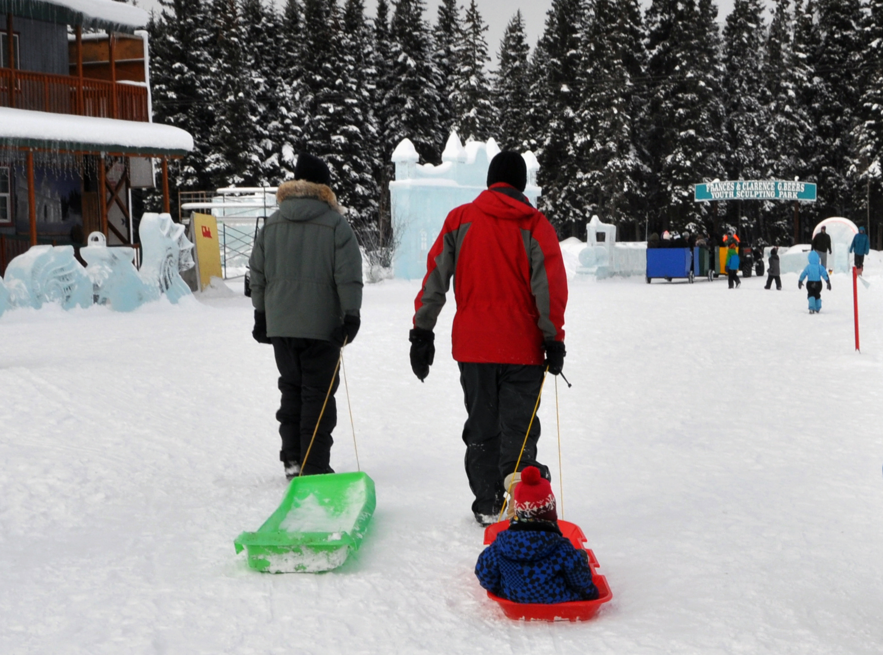 They use chisels, chainsaws and heat guns to sculpt massive, detailed ice sculptures. Each artist also helps construct the Kids Park – an outdoor playground complete with slides, tunnels and climbing structures, made completely out of ice.