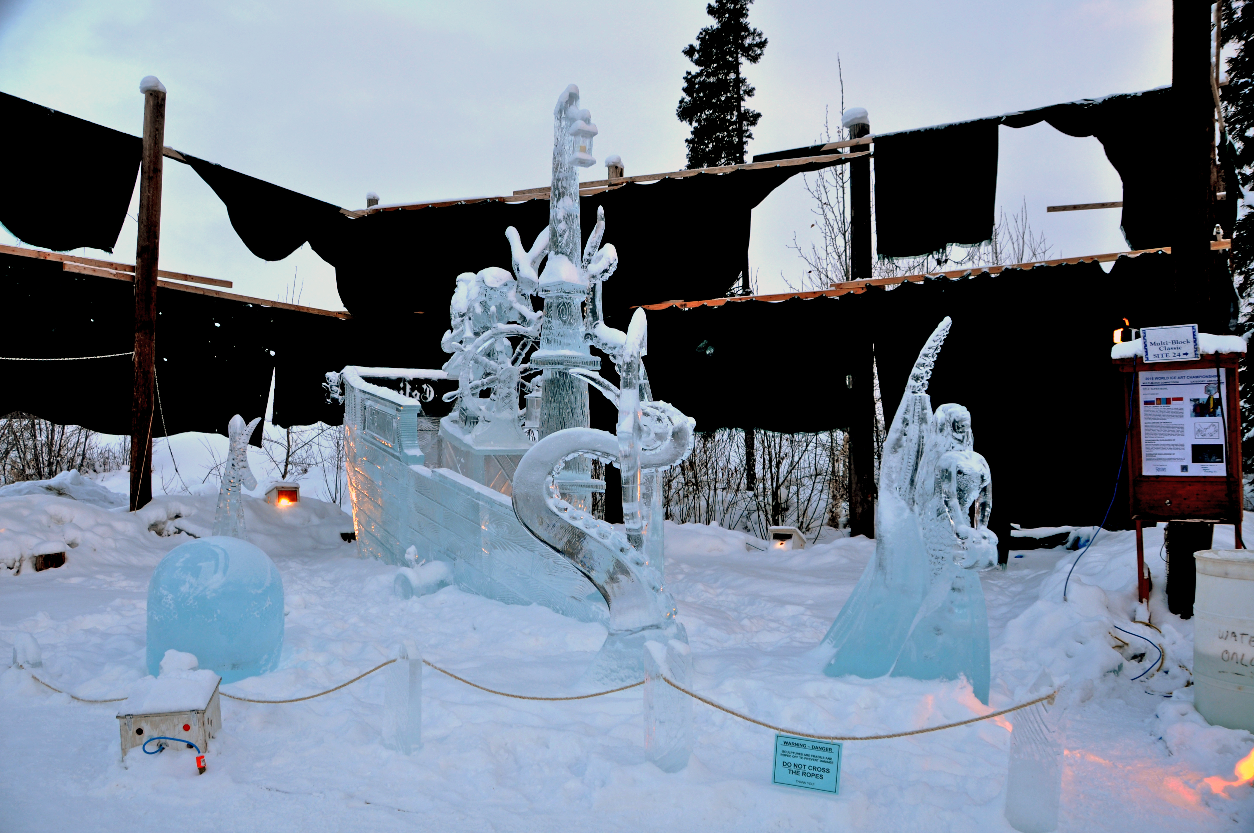 A pirate ship, a superhero scene, a faucet with a round, glistening drop of water. These are just some of the otherworldly ice sculptures on display through the end of the month at Ice Alaska: 2015 BP World Ice Art Championships in Fairbanks, Alaska.